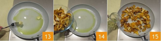 In a large pan, sauté a peeled and halved garlic clove, then remove it 13 and add the mushrooms 14. Cook them over high heat, deglazing with white wine 15; cook for about 8 minutes.