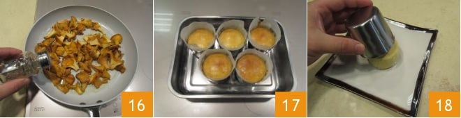 Then salt and pepper and turn off the heat 16. Once the flans are ready, when a delicious crust has formed on the surface 17, take them out of the oven, remove the parchment paper, and flip them onto a serving plate 18.