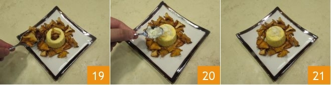 Then decorate each flan with chanterelle mushrooms 19 and flakes of Grana cheese 20. Your Grana cheese flans with chanterelle mushrooms are ready to be enjoyed 21!