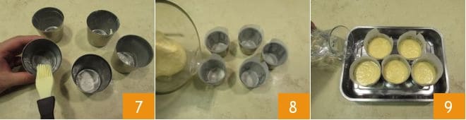 Take the molds with a diameter of 2.75 inches and a height of 2.56 inches, brush them with oil 7, and line them with strips of parchment paper wide enough so that the edges protrude from the molds 8: this way, you can more easily detach the flans from the edges once cooked. Pour the mixture inside, leaving about 0.4 inches from the edge, then place them in a baking dish with high edges and pour water (at room temperature) into the dish so that it covers the molds by a couple of inches 9. Cook the flans in a preheated convection oven at 320°F for 45 minutes (or static at 356°F for 50-55 minutes).