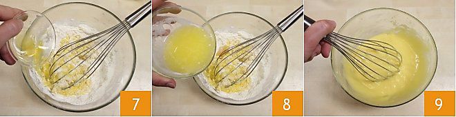 Continue by adding the honey 7 and the previously melted butter 8, then mix well with a hand whisk 9.
