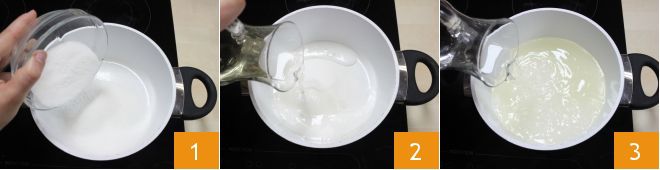 To prepare the Bellini granita, start with the syrup: place the sugar in a small saucepan 1, pour in the Prosecco 2, and add the water 3. Let the sugar dissolve and bring to a near boil. Then turn off the heat and let the syrup cool.