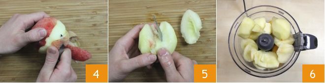 In the meantime, peel the peaches 4, remove the pit, cut them into slices 5, and place them in a blender 6.