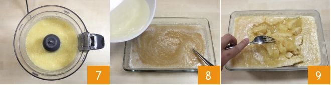 Blend the peach slices until you obtain a smooth mixture 7. Then transfer the peach puree to a wide, shallow container to facilitate freezing, and add the now-cool syrup 8. Mix everything together and place in the freezer. After 30 minutes, break the ice crystals that have formed with the tines of a fork 9.