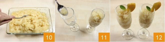 Repeat the process three more times: place the granita back in the freezer and every 30 minutes take it out to mix the mixture with a fork, until you achieve the consistency of granita 10. At this point, pour the granita into flûte glasses 11, decorate with a few mint leaves, and garnish the glass with peach slices 12, your Bellini granita is ready to be enjoyed!
