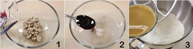 To make the grape flatbread, start by preparing the bread dough: dissolve the yeast in a little lukewarm water 1 (taken from the total amount of water required for the recipe) and add a teaspoon of malt (or sugar or honey) 2, then mix everything and let it rest for a few minutes. Put the sifted flour in a stand mixer, add the yeast, water, and malt mixture 3.