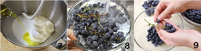 When the bread dough is ready, transfer it back to the stand mixer and knead it with 50 grams of sugar and 4 tablespoons of oil, for another 5 minutes 7 (if you prefer, you can perform the same operation manually, spreading the dough on a floured board and kneading it by hand). Take the grapes, wash them under cold running water 8 and detach all the grapes 9.