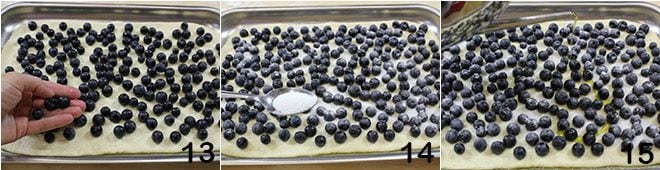 then lay a dough sheet and entirely cover its surface with half of the total amount of grapes 13, a tablespoon of sugar 14, and some extra virgin olive oil 15.