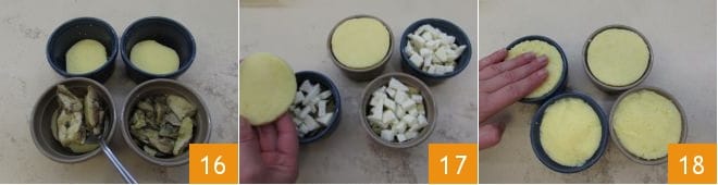 Finish the terrines 19 with the remaining scamorza cheese and gratinate for about 10 minutes in a static oven at 392°F 20 (if using a convection oven, bake for about 6 minutes at 356°F). Remove from the oven 21 and serve the polenta and porcini mushroom terrines while hot.