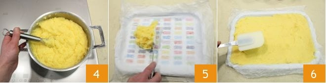 Continue by stirring the polenta with a spatula 4 or a wooden spoon to mix it well. When the polenta is ready, pour it onto a tray lined with parchment paper 5, and level the surface 6. You need to achieve a thickness of about 0.4 inches, then let it rest at room temperature.