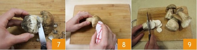 Meanwhile, focus on How to Clean Porcini Mushrooms: using a small knife, remove the excess soil from the stem 7 and clean the entire mushroom with a slightly damp cloth 8. At this point, slice the porcini mushrooms, not too thinly 9.