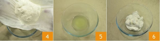 Store everything in the refrigerator for at least 4 hours (you can leave it for 6-8 hours if you prefer a thicker and creamier consistency). After the time has passed, lift the cheesecloth 4, and you will notice that some whey has dripped from the yogurt into the bowl 5. Then put the obtained Greek yogurt (about 12 oz) into a bowl 6. Your homemade Greek yogurt is ready!