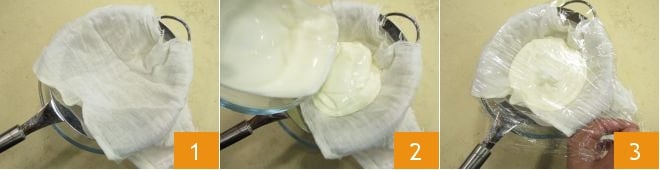 To prepare the Greek yogurt, start by placing a sieve in a bowl and line it with a sterile cheesecloth (or alternatively, a very clean kitchen towel) 1. Pour in the plain yogurt 2 and cover with plastic wrap 3.