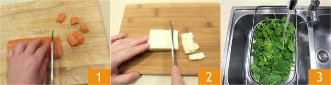 To make the green omelette with salmon, toma, and saffron sauce, start by cutting the salmon fillet into cubes 1, do the same with the toma 2. Wash the spinach under running water 3 and drain them,