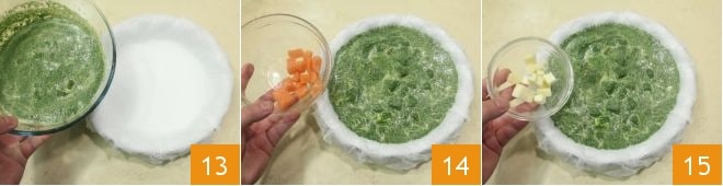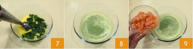 add the cooked spinach 7, blend the mixture with an immersion blender to obtain a homogeneous mixture 8, incorporate the salmon cubes 9 leaving one tablespoon aside,