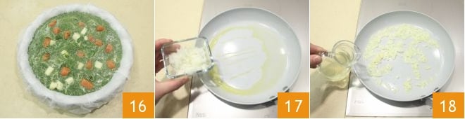 Once finished 16, bake the omelette in a static oven at 356°F for 50 minutes (or in a convection oven at 320°F for 40 minutes). Check the cooking by inserting a toothpick into the omelette, if it comes out dry, you can remove it from the oven. While the omelette is baking, prepare the saffron sauce: heat the oil in a pan, add the chopped onion 17 add the vegetable broth 18 and stew for at least 10 minutes,