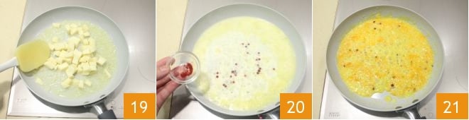 then add the toma in pieces 19 and continue cooking to melt it. When the cheese has completely melted, add pink peppercorns, saffron powder 20 and stir with a spatula to mix it into the sauce and obtain a uniform color 21.
