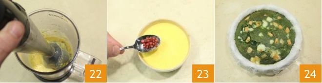 Transfer the sauce to a tall glass and blend it with an immersion blender 22 to make it smooth. Transfer the sauce to a small bowl and add more pink peppercorns to taste 23. Meanwhile, the omelette will be cooked, remove it from the oven 24 let it cool slightly and then serve it with the sauce.