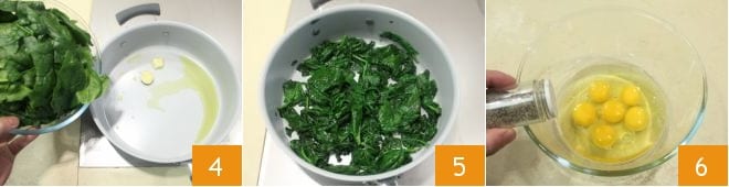 place them in a pan with a drizzle of olive oil and a garlic clove 4 and let them wilt over high heat for 10-15 minutes until they are soft and let them cool down 5. In a bowl, beat the eggs with a pinch of salt and pepper 6