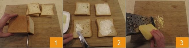 To prepare the grilled cheese sandwich, first slice the sandwich bread, you should get 8 slices about 0.6 inches (1.5 cm) thick 1. Then butter all 8 slices on only one side 2. With a large-hole grater, grate the cheddar cheese 3.