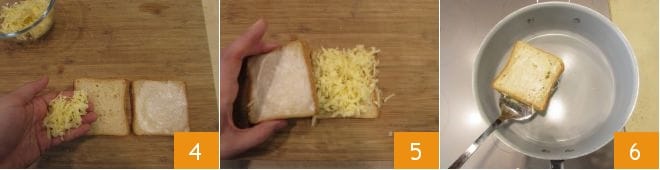 and generously distribute it on 4 slices, sprinkling it on the unbuttered side 4. Close with the other slice of bread, with the buttered side facing out 5: this way, all 4 sandwiches will have cheese inside and the buttered part on the outside. Let a non-stick pan heat well over moderate heat and place your sandwich in it 6.