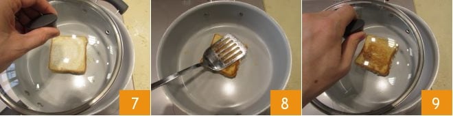 Cover with a lid 7 and wait a couple of minutes. Flip the sandwich, press it slightly 8 to aid the cheese melting; cover again 9 and cook for another minute.