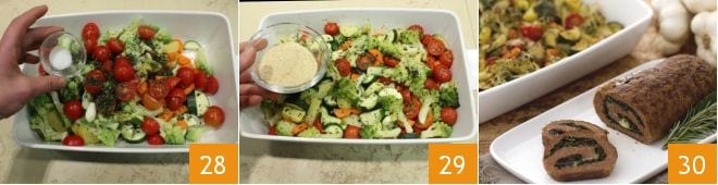 a clove of garlic, salt 28, ground pepper, and then cover them with a layer of breadcrumbs 29. Cook in a Samsung 3 oven using the automatic setting for single cooking A17 (roasted vegetables), at the end of the program, move the tray to the top shelf and turn on the grill for a few minutes to achieve a better browning 30. The dishes are ready: slice the ground meat roll and serve it with the roasted vegetable tray.