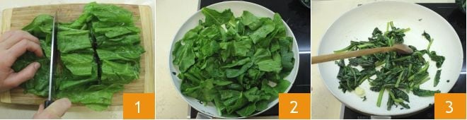 To prepare the ground meat roll with the vegetable tray, start by preparing the roll: wash the greens, cut them 1, and cook them in a pan with a drizzle of oil and a clove of garlic 2 until tender 3.