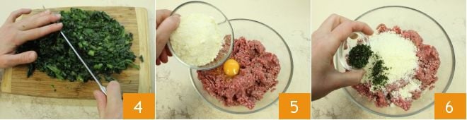 Once cooked, chop the greens 4 and set them aside to cool. Meanwhile, in a large bowl, place the ground meat, add the eggs, grated cheese 5, and the chopped aromatic herbs 6,