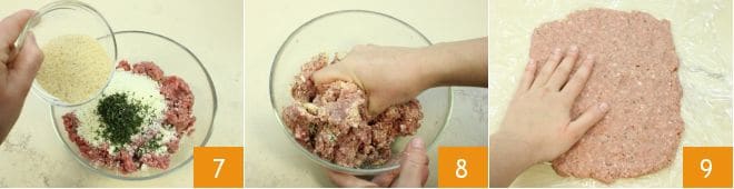 the breadcrumbs 7. Mix the dough with your hands to combine all the ingredients 8. Take a sheet of plastic wrap and place it on a work surface, and spread the ground meat over it, shaping the dough into a rectangle of about 9x10 inches 9.