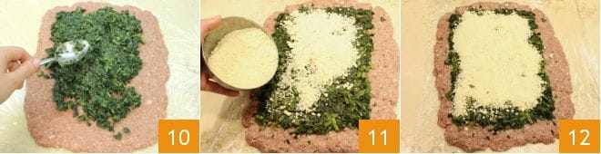 Spread the filling on top: first a layer of greens 10 and then a layer of grated Parmesan cheese (11-12).