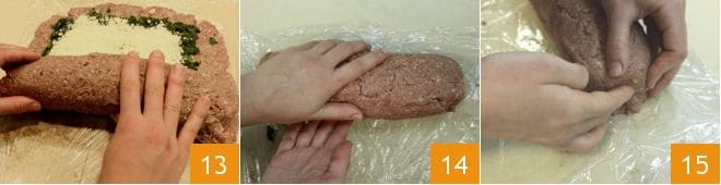 Roll up the roll using the plastic wrap (13-14), making sure to seal the two ends with the ground meat 15.