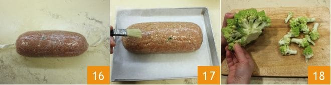 Press the ground meat into the plastic wrap so that it takes the shape of the roll 16. Once you have the roll, place it on a baking sheet lined with parchment paper and brush it with olive oil 17. Bake the roll in a Samsung 3 oven using the automatic setting for single cooking A-12, placing the tray on the lower shelf, turning the roll halfway through cooking when the oven beeps. Before finishing cooking, move it to the top shelf to get a crispy crust. While the roll cools, take care of the vegetables: wash the broccoli, separate the florets from the central stem, and cut them in half 18.