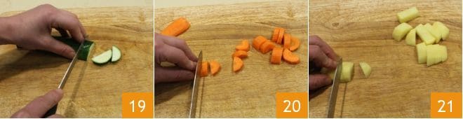 Wash and trim the zucchini, cut them in half lengthwise, and then into wedges 19. Wash the carrots and cut them using the same method as the zucchini 20. Continue by washing the potatoes, then peel them and cut them into small wedges the same size as the other vegetables to ensure even cooking 21.
