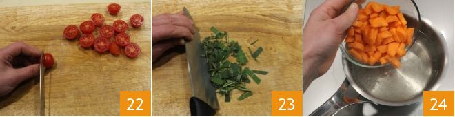 Finally, wash and halve the cherry tomatoes 22. Finely chop the aromatic herbs: rosemary, bay leaf, thyme, and sage 23. Blanch the carrots for a few minutes 24 and
