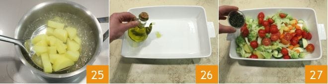 the potatoes 25. Take a large tray, pour in a drizzle of oil 26, and transfer all the previously cut vegetables inside, seasoning with the chopped herbs 27