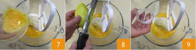 Then pour in the beaten eggs 7, the grated zest of an untreated lemon 8, and the grappa 9.