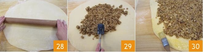 Roll out the risen dough with a rolling pin to a thickness of about 1/5 inch 28: it should be roughly a rectangle of about 20x24 inches. Place the filling inside 29, leaving a border of about 3/4 inch. Brush these edges with beaten egg 30