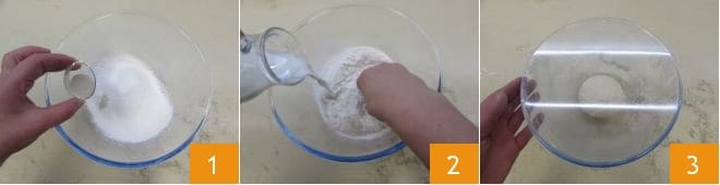 To prepare gubana, start with the starter dough: in a large bowl, sift the flour, then add the dry yeast 1. Gradually add the warm milk 2 and knead with your hands until you obtain a smooth mixture without lumps. Shape it into a ball and let it rest at room temperature covered with plastic wrap for about 1 hour 3.
