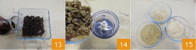 Meanwhile, prepare the gubana filling. Rinse and then place the raisins in a bowl to soak in 100 g of marsala 13; let them soften this way for at least 20 minutes or more if needed. While the raisins are softening, blend the walnut kernels in a mixer until you get a very fine chop 14. Repeat the process for the pine nuts and almonds, to obtain 3 separate chops 15.