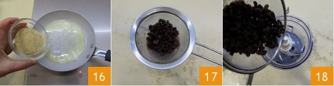 Now, take a non-stick pan with a wide base and melt the butter over low heat. Once completely melted, add the breadcrumbs 16: toast it for about 5 minutes. Stir lightly with a wooden spoon or toss it to prevent burning. When ready, turn off the heat and set it aside in a small bowl. Then take the softened raisins, drain them 17, and blend finely 18.
