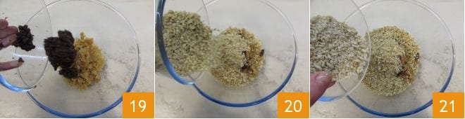Now you can start combining the ingredients for the gubana filling: in a bowl pour the toasted breadcrumbs, raisins 19, walnuts 20, and pine nuts 21.