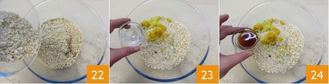 Then add the almonds 22, the grated zest of an untreated lemon, the grappa 23, and the remaining 10 g of marsala 24.