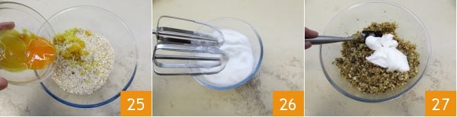 Separate the yolks from the whites and pour the yolks into the bowl with the other filling ingredients 25, while in a separate bowl, whip the egg whites to stiff peaks 26, then add them to the other ingredients 27, folding gently with a spatula from bottom to top, making sure not to deflate the egg whites. The filling is now ready.