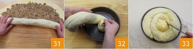 Start rolling the dough onto itself 31, slightly lengthening it by moving your hands from the center outward. Seal the edges well to prevent the filling from escaping. Take a 9-inch diameter buttered and floured pan 32: start placing one end of the roll in the center and coil it onto itself within the mold to create a spiral shape. Let rise in the turned-off oven with the light on for another 30 minutes. Then brush the entire surface of the gubana with the egg 33.