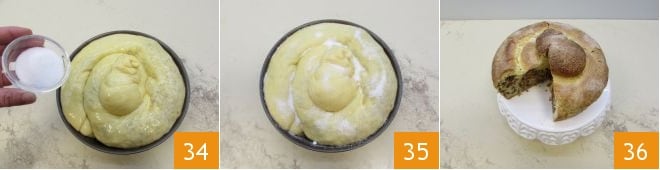Sprinkle with sugar 34 and bake in a preheated static oven at 340°F for 60 minutes (or bake in a preheated convection oven at 290°F for 40-45 minutes) 35. After the baking time, remove the pan from the oven and let it rest for 10 minutes before serving your gubana 36!