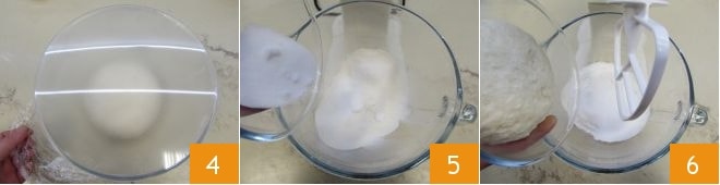 The starter dough should double in volume 4: if it hasn't reached the necessary volume, let it rise further. Now take a stand mixer with the paddle attachment and pour in the sifted flour and sugar 5, then add the starter dough 6.