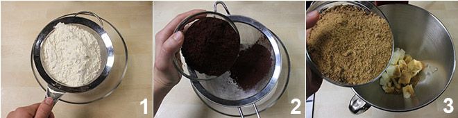 To prepare the Guinness chocolate cake, sift the flour together with the baking powder and cocoa powder into a bowl (1-2). Then place the softened butter and dark brown sugar in a bowl 3 and beat the ingredients together with a stand mixer or an electric mixer to cream them.