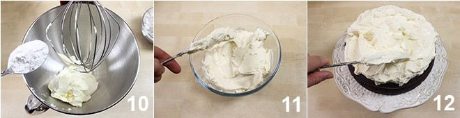 Meanwhile, prepare the topping cream: mix the mascarpone with the Philadelphia and powdered sugar 10, working the ingredients with a whisk to obtain a soft and dense cream 11. Spread the cream on the cake and create swirls that resemble the foam of Guinness beer. Your Guinness chocolate cake is ready to be served!