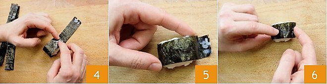 Wrap the nori seaweed around the rice ball 4 and spread some cooked rice grains along the upper edge of the seaweed 5, then secure the edges well 6.